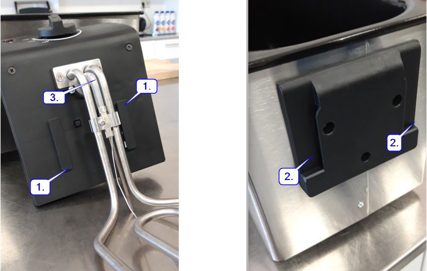 Veuillez vérifier que la friteuse est correctement montée comme suit : L'élément chauffant (3.) glisse exactement avec les blocs (1.) dans le guide (2.) du bac extérieur de manière à ce que l'interrupteur de sécurité soit enfoncé et activé. | ![]() |