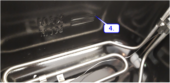 Une fois que l'élément chauffant est bien placé, remplissez l'appareil avec la quantité d'huile ou de graisse nécessaire. Veillez à ce que l'appareil soit rempli au moins jusqu'au l'appareil est rempli au moins jusqu'au niveau minimum et pas plus haut que le niveau maximum (4.), comme indiqué à l'intérieur de la friteuse. Pour des résultats optimaux, nous vous conseillons d'éviter de mélanger différents types d'huile. | ![]() |