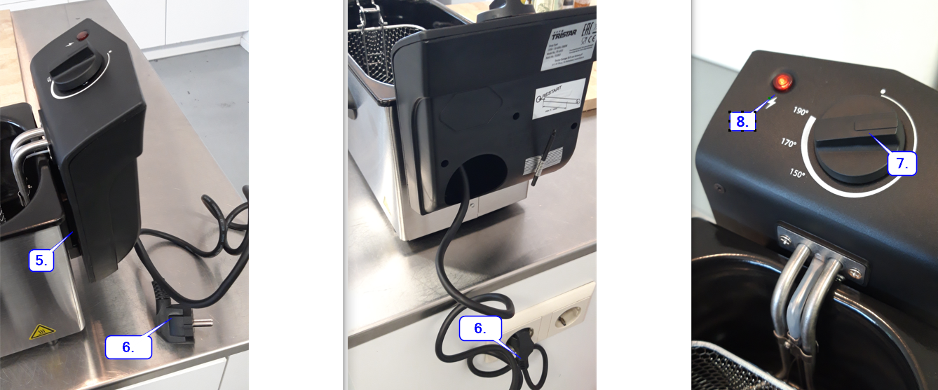 | Si l'élément chauffant est bien placé et que de l'huile ou de la graisse est ajoutée (4. et 5.), vous pouvez brancher la fiche sur le secteur (6). Choisissez la température souhaitée (7.) et la graisse ou l'huile se réchauffe (8. lumière rouge). Dès que la température est atteinte, le voyant s'allume en vert et les aliments sont prêts à être frits dans le panier. | ![]() |